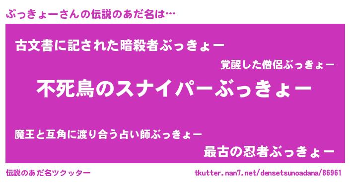| 男性向けラノベタイトル風あだ名 | 『この素晴らしい世界にぶっきょーを!』 |