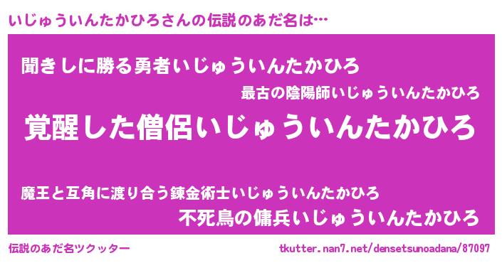 | 男性向けラノベタイトル風あだ名 | 『いじゅういんたかひろ~年齢イコール彼女いない歴の魔法使い~』 |