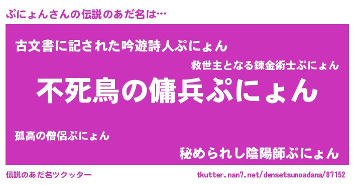 | 男性向けラノベタイトル風あだ名 | 『ぷにょんの憂鬱』『魔弾の王とぷにょん』 |