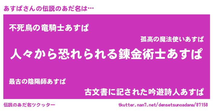 | 意味不明あだ名 | 『住所不定無職あすぱ(85歳)』 |