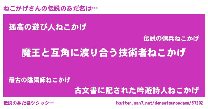 | 男性向けラノベタイトル風あだ名 | 『おまえをオタクにしてやるから、俺をねこかげにしてくれ! 』 |
