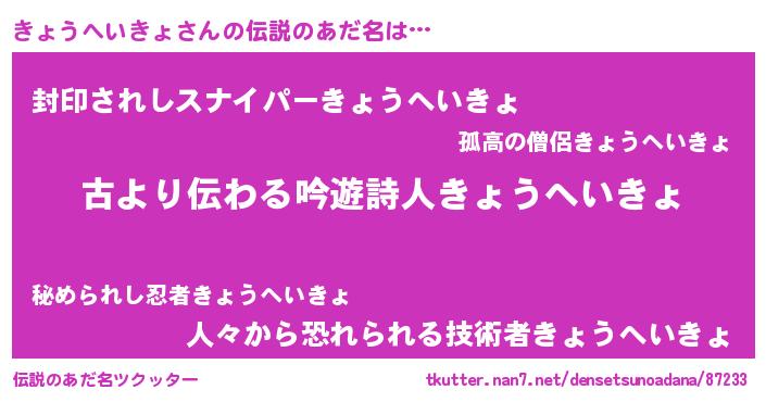 | 男性向けラノベタイトル風あだ名 | 『転生したらきょうへいきょだった件』 |