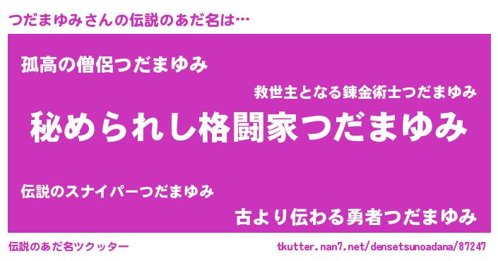 | 男性向けラノベタイトル風あだ名 | 『魔弾の王とつだまゆみ』 |