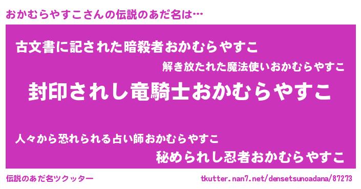 | 男性向けラノベタイトル風あだ名 | 『おかむらやすこ~年齢イコール彼女いない歴の魔法使い~』 |