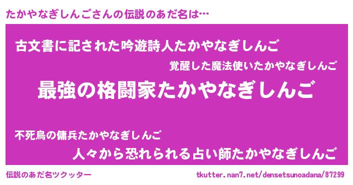 | 意味不明あだ名 | 『たかやなぎしんごフォーエバー』 |