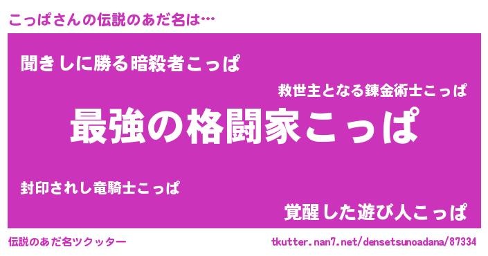 | 男性向けラノベタイトル風あだ名 | 『うちの娘の為ならば、俺はもしかしたらこっぱも倒せるかもしれない。』 |