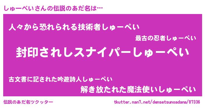 | 男性向けラノベタイトル風あだ名 | 『しゅーぺいに滅ぼされるだけの簡単なお仕事です』 |