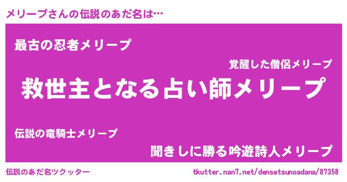 | 女子向けラノベタイトル風あだ名 | 『死神メリープの再婚』 |