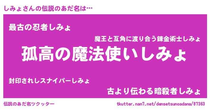 | 胡散臭い通販商品みたいなあだ名 | 『信頼と実績のサプリメント…その名も「しみょ」』 |