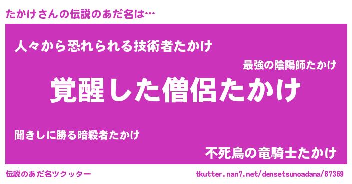 | 男性向けラノベタイトル風あだ名 | 『たかけの嫁は女の子じゃないと思った?』 |