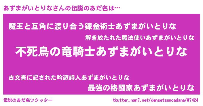 | 女子向けラノベタイトル風あだ名 | 『あずまがいとりな姫と円卓の騎士』 |