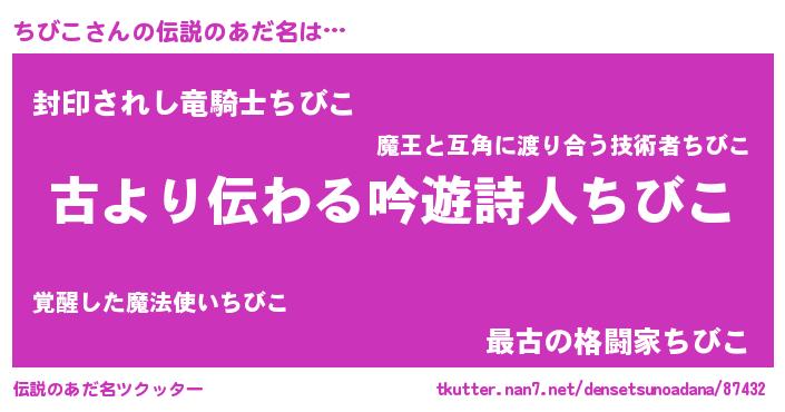 | 男性向けラノベタイトル風あだ名 | 『ちびこという概念が存在しない退屈な世界 』 |