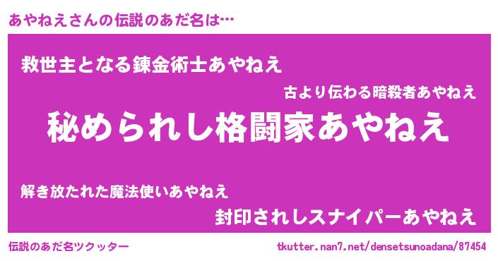 | ファンタジー風あだ名 | 『ゼアヤトゥ』『エターナルアヤネエー』 |