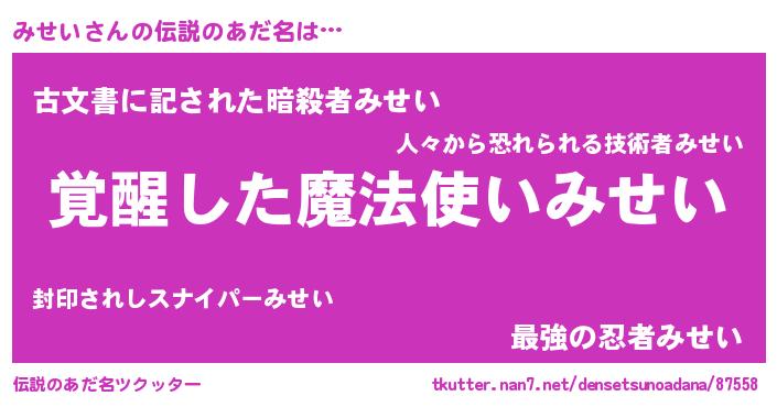 | ヒーロー風カッコイイあだ名 | 『天弓騎士ミセ』『ネオミセイ』 |