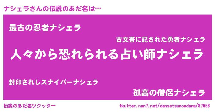 | 男性向けラノベタイトル風あだ名 | 『おまえをオタクにしてやるから、俺をナシェラにしてくれ! 』 |