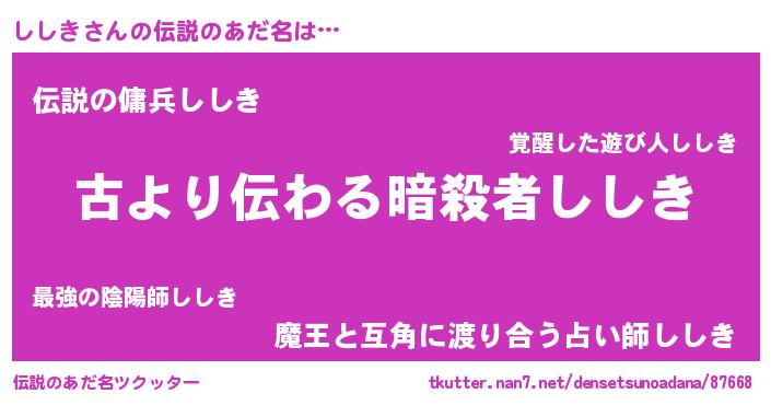 | 男性向けラノベタイトル風あだ名 | 『転生したらししきだった件』 |