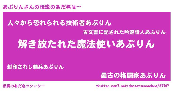 | ヒーロー風カッコイイあだ名 | 『魔戒騎士アプ』『正義の使者あぷりん』 |