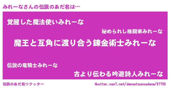 | ヒーロー風カッコイイあだ名 | 『愛の使者みれーな』『炎刃騎士ミレ』 |