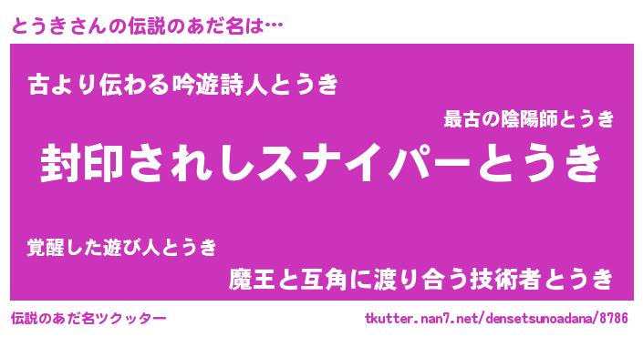 | ヒーロー風カッコイイあだ名 | 『最強戦士トウキ』『スーパートウキ』 |