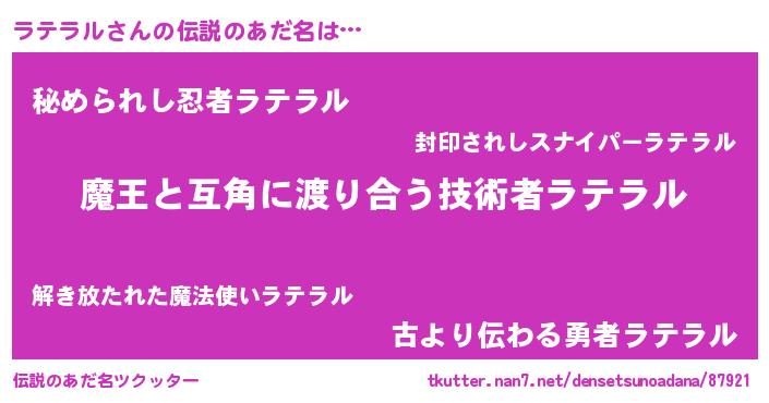 | 男性向けラノベタイトル風あだ名 | 『この素晴らしい世界にラテラルを!』 |