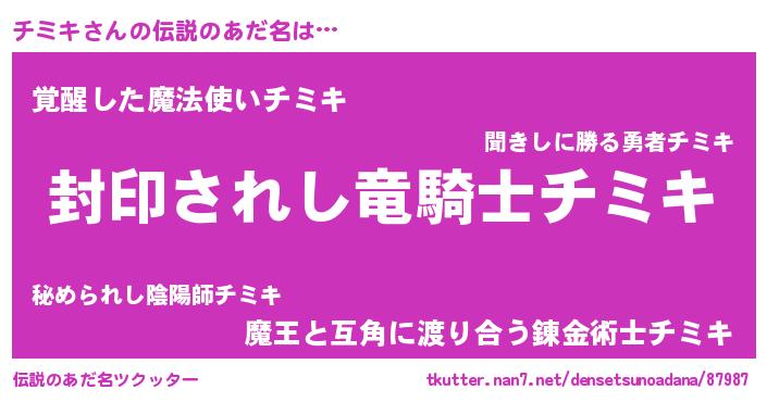 | 男性向けラノベタイトル風あだ名 | 『Re:チミキから始める異世界生活』 |