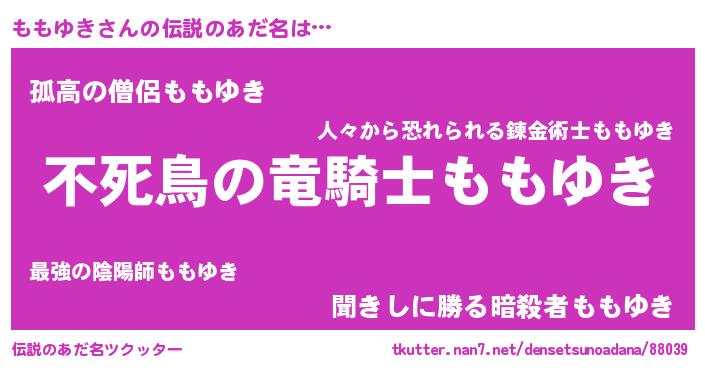 | 男性向けラノベタイトル風あだ名 | 『ももゆきの憂鬱』『魔弾の王とももゆき』 |