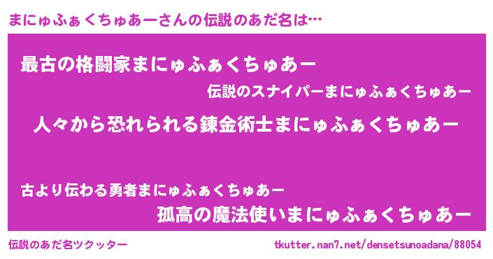 | 男性向けラノベタイトル風あだ名 | 『おまえをオタクにしてやるから、俺をまにゅふぁくちゅあーにしてくれ! 』 |