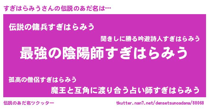 | 男性向けラノベタイトル風あだ名 | 『すぎはらみう~年齢イコール彼女いない歴の魔法使い~』 |