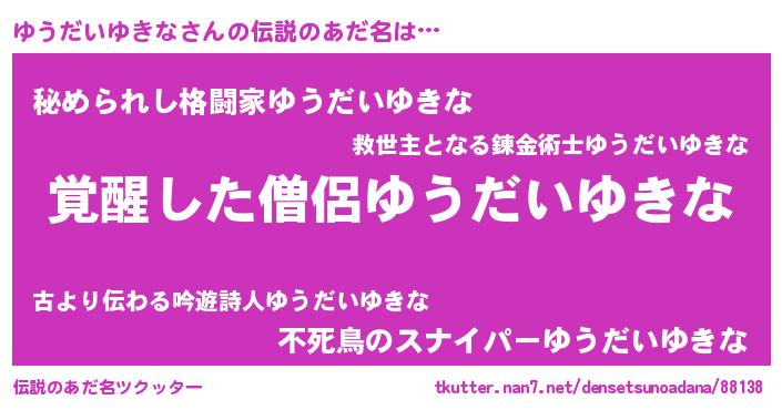 | 男性向けラノベタイトル風あだ名 | 『ゆうだいゆきなの嫁は女の子じゃないと思った?』 |