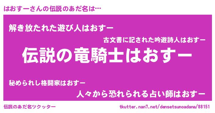 | 男性向けラノベタイトル風あだ名 | 『はおすーの憂鬱』『魔弾の王とはおすー』 |
