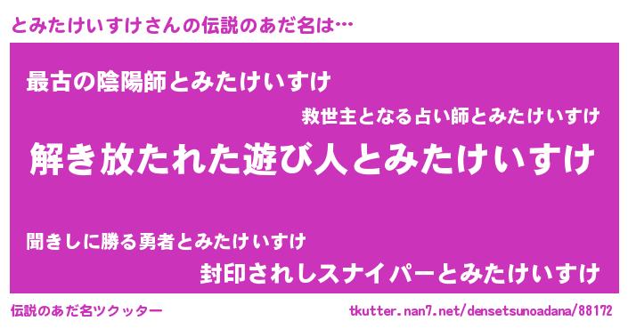 | 男性向けラノベタイトル風あだ名 | 『とみたけいすけの嫁は女の子じゃないと思った?』 |