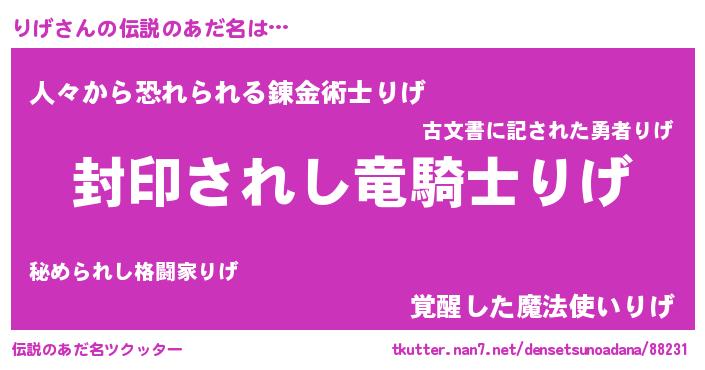 | 女子向けラノベタイトル風あだ名 | 『男装りげの憂鬱な任務』『闇のりげ』 |