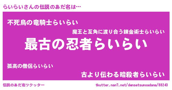| ヒーロー風カッコイイあだ名 | 『ウルトラらいらいマン』『ネオライライ』 |