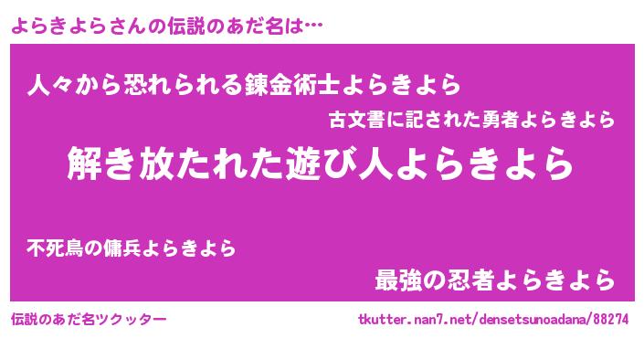 | 女子向けラノベタイトル風あだ名 | 『乙女ゲームの破滅フラグしかない悪役よらきよらに転生してしまった…』 |