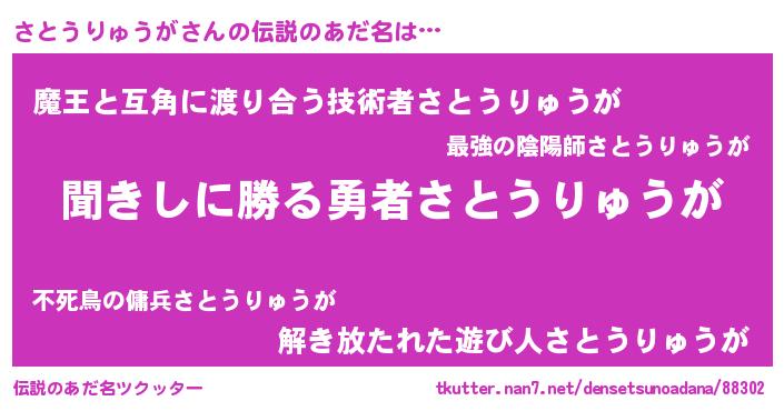 | 男性向けラノベタイトル風あだ名 | 『さとうりゅうがという概念が存在しない退屈な世界 』 |