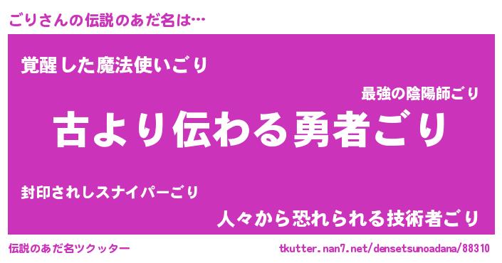 | 男性向けラノベタイトル風あだ名 | 『はたらくごりさま!』『魔弾の王とごり』 |