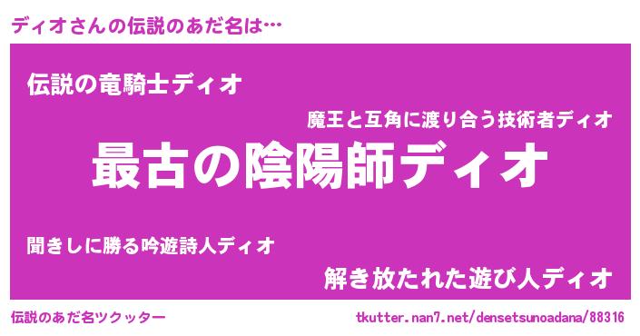 | 女子向けラノベタイトル風あだ名 | 『乙女ゲームの破滅フラグしかない悪役ディオに転生してしまった…』 |