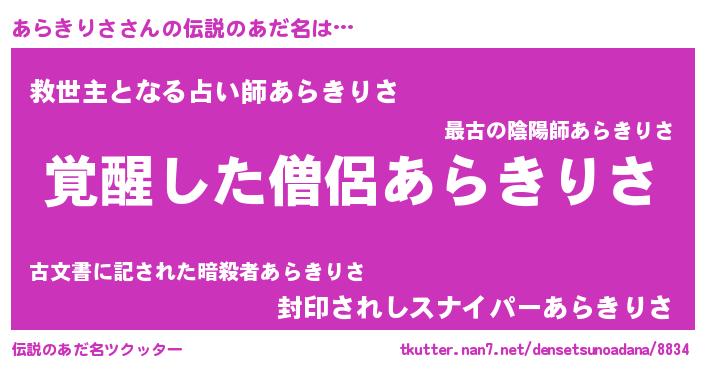 | ヒーロー風カッコイイあだ名 | 『究極戦士アラキリサ』『天弓騎士アラ』 |
