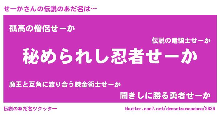 | ヒーロー風カッコイイあだ名 | 『ウルトラせーかマン』『炎刃騎士セー』 |