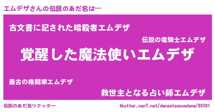 | ヒーロー風カッコイイあだ名 | 『天弓騎士エム』『ネオエムデザ』 |