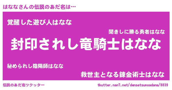 | 男性向けラノベタイトル風あだ名 | 『はなな~年齢イコール彼女いない歴の魔法使い~』 |