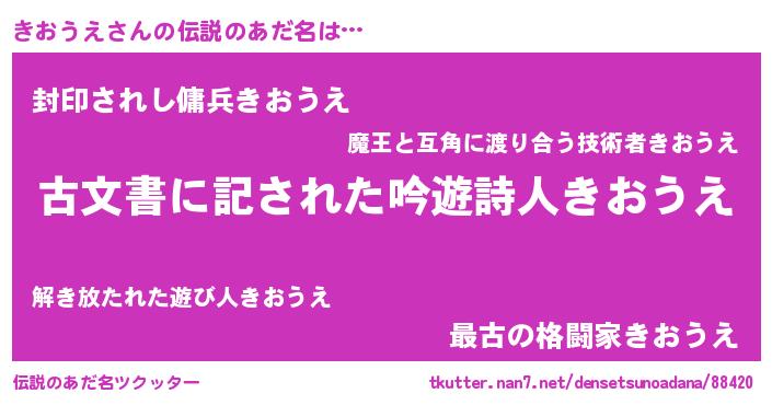 | 意味不明あだ名 | 『自称きおうえ』『しいたけ科きおうえ属』 |