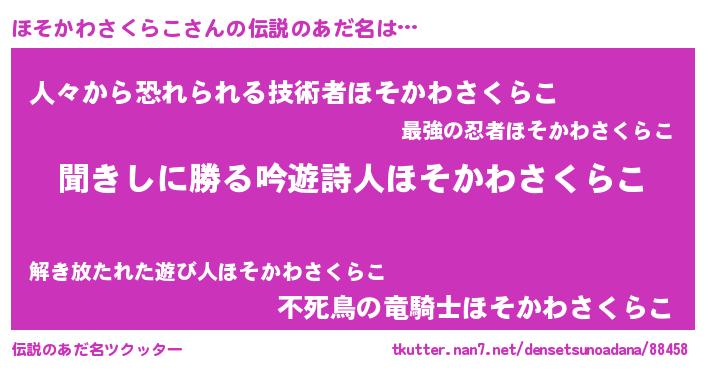 | 女子向けラノベタイトル風あだ名 | 『異世界で失敗しない100のほそかわさくらこ』 |
