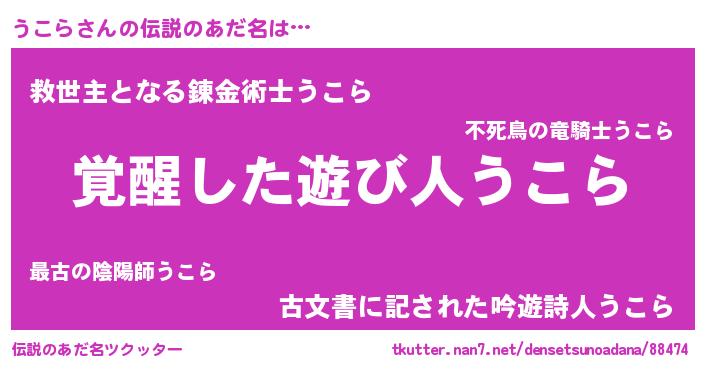 | ヒーロー風カッコイイあだ名 | 『炎刃騎士ウコ』『天空の使者うこら』 |