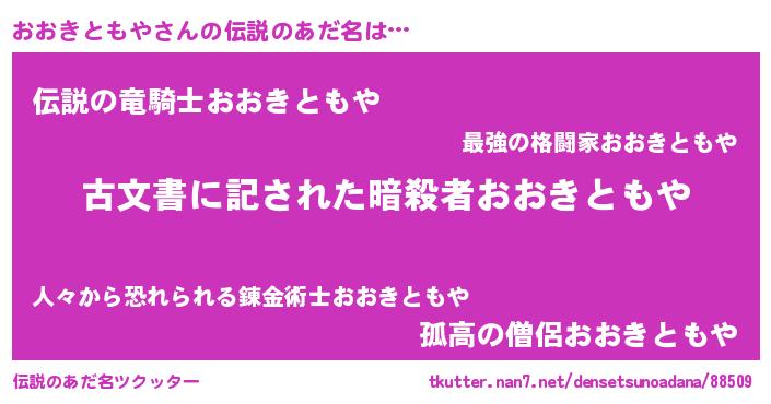 | 男性向けラノベタイトル風あだ名 | 『おおきともや~年齢イコール彼女いない歴の魔法使い~』 |