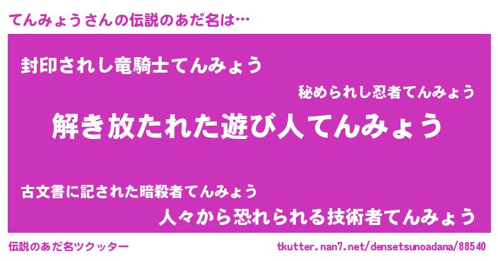 | 男性向けラノベタイトル風あだ名 | 『ダンジョンにてんみょうを求めるのは間違っているだろうか』 |