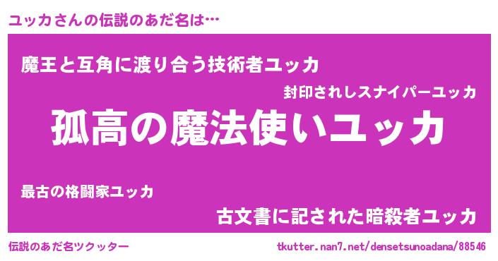 | ヒーロー風カッコイイあだ名 | 『黄金騎士ユッ』『サイバー戦士ユッカ』 |