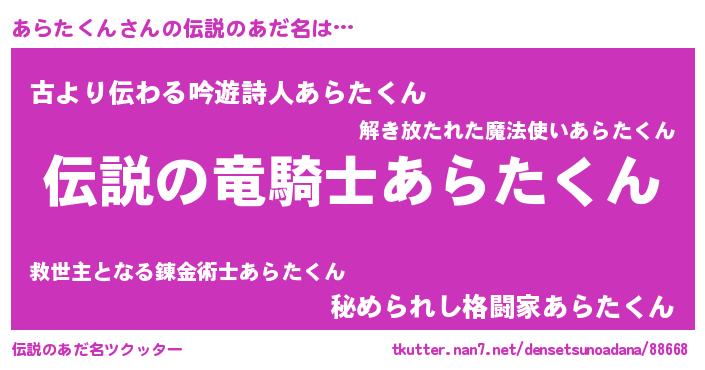 | 男性向けラノベタイトル風あだ名 | 『緋弾のアラタクン』『あらたくんの憂鬱』 |