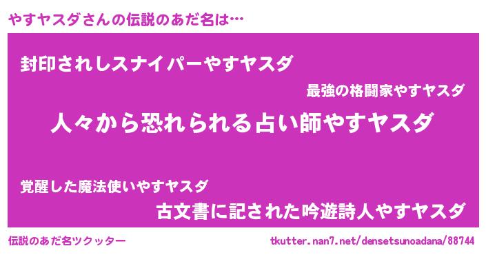 | 男性向けラノベタイトル風あだ名 | 『ヤスヤスダスレイヤー』 |