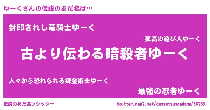 | 男性向けラノベタイトル風あだ名 | 『ゆーくという概念が存在しない退屈な世界 』 |